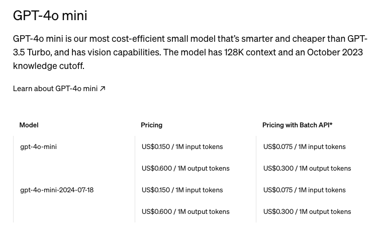 GPT-4o-mini现在可以作为文本和视觉模型在 Assistant API、Chat Completions API 和 Batch API 中使用。开发人员每 100 万输入 token 价格为 15 美分,每 100 万输出 token(大约相当于一本标准书的 2500 页)价格为 60 美分。