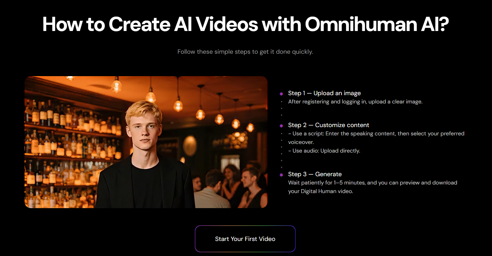 1 张图 +1 段音频,Omnihuman AI 即刻生成口型精准、手势自然的数字人视频!真人/动漫/3D 形象全支持,演讲、唱歌、产品解说智能驱动,字节跳动技术背书, 独家解决”僵尸肢体”痛点,流畅度提升 300%。