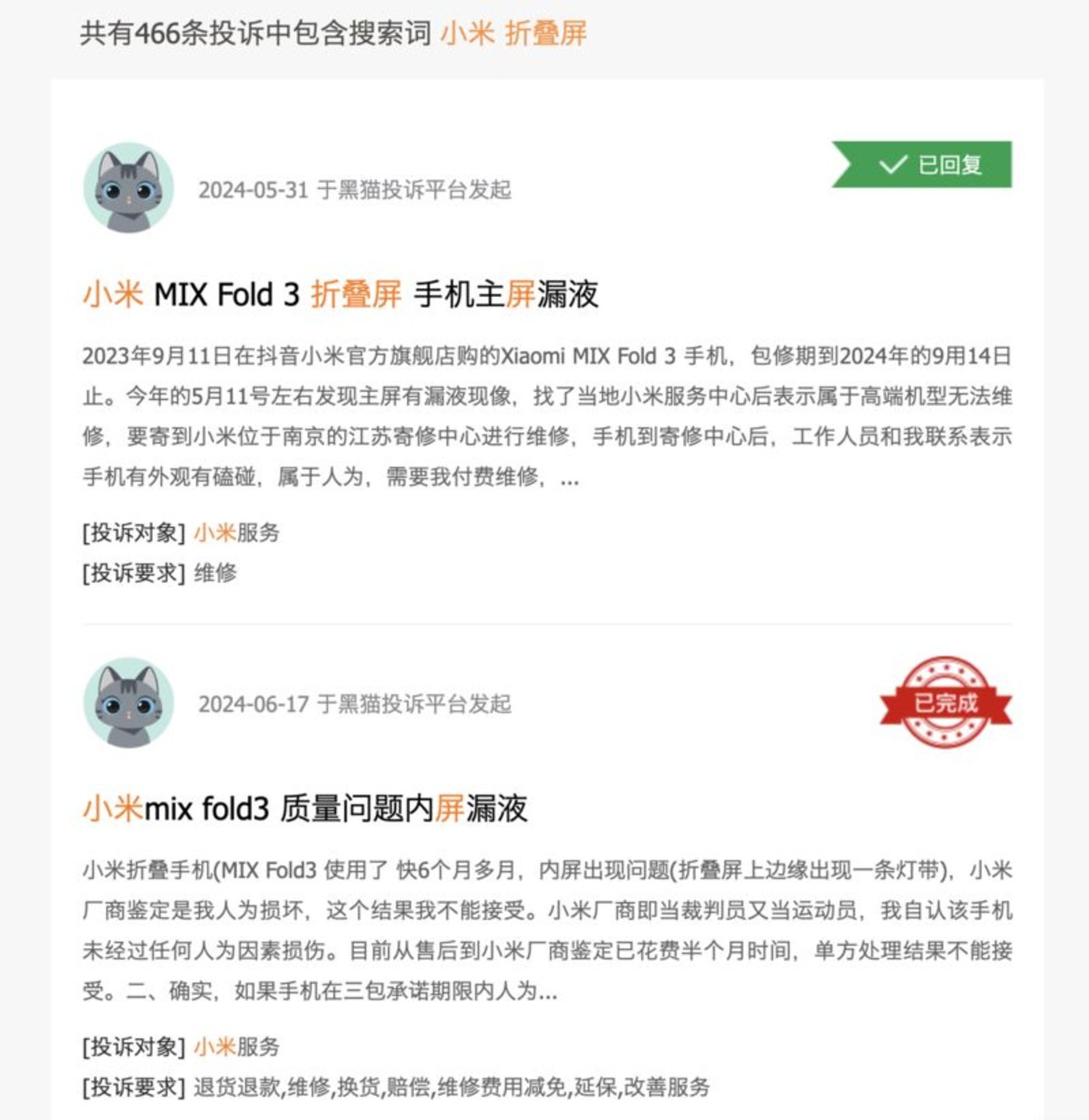 在黑猫投诉平台,PConline统计发现,“小米折叠屏”的投诉量为466条,“华为折叠屏”“vivo折叠屏”“荣耀折叠屏”“OPPO折叠屏”分别为786条、69条、368条和110条。在销量远不如其他厂商的情况下,投诉量却不低,从销量与投诉量的比值来看,小米折叠屏投诉率已大大超过同行。