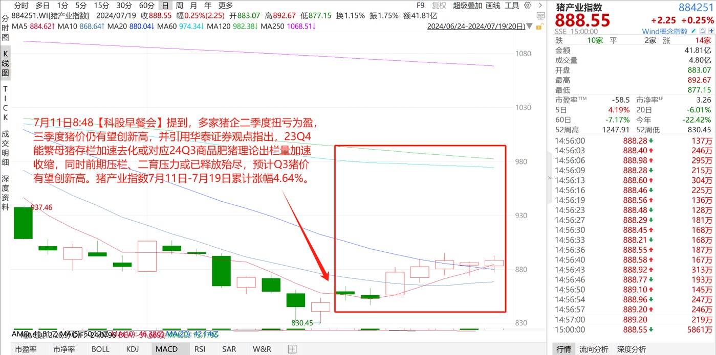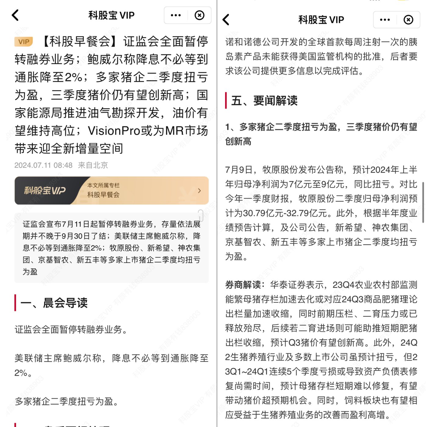 7月11日8:48【科股早餐会】提到,多家猪企二季度扭亏为盈,三季度猪价仍有望创新高,并引用华泰证券观点指出,23Q4能繁母猪存栏加速去化或对应24Q3商品肥猪理论出栏量加速收缩,同时前期压栏、二育压力或已释放殆尽,预计Q3猪价有望创新高,同时饲料板块也有望相应受益于生猪养殖业务的改善而盈利高增。