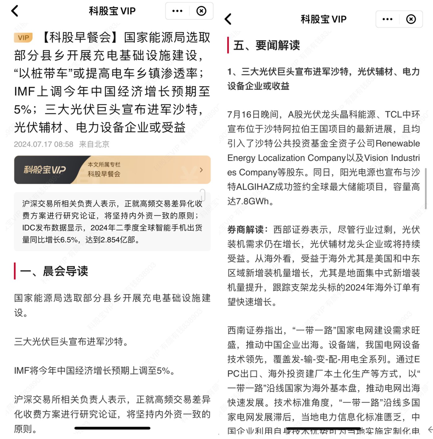 7月17日8:58【科股早餐会】提到,三大光伏巨头宣布进军沙特,并引用西部证券观点表示,从海外看,受益于海外尤其是美国和中东区域新增装机量增长,尤其是地面集中式新增装机量提升,跟踪支架龙头标的2024年海外订单有望快速增长。