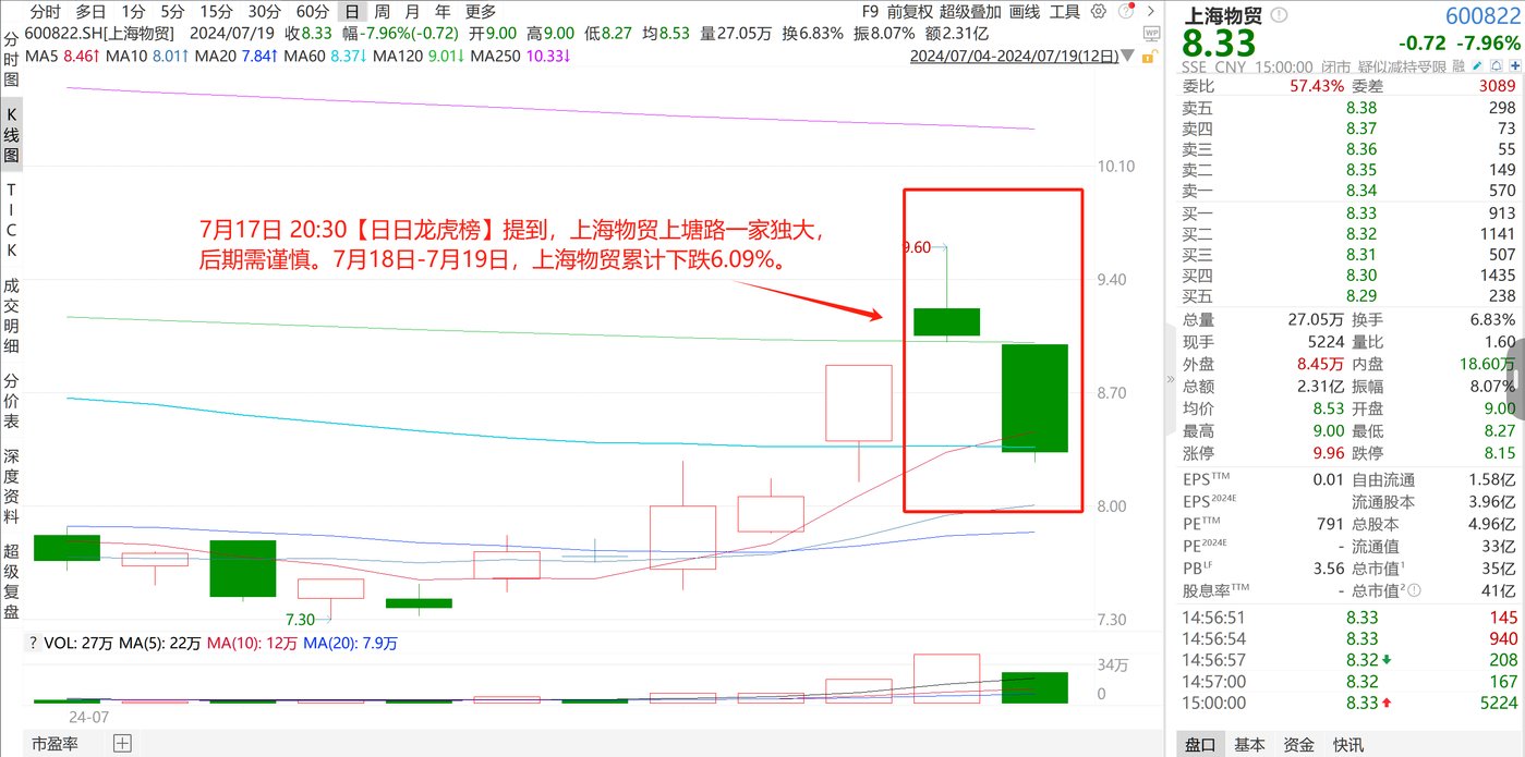 (2)7月17日20:30【日日龙虎榜】提到,上海物贸上塘路一家独大,后期需谨慎。