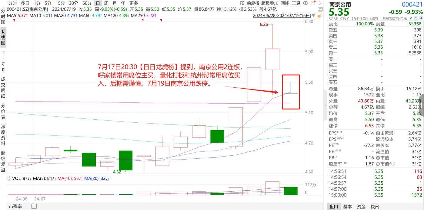 (3)7月17日20:30【日日龙虎榜】提到,南京公用2连板,呼家楼常用席位主买,量化打板和杭州帮常用席位买入,后期需谨慎。