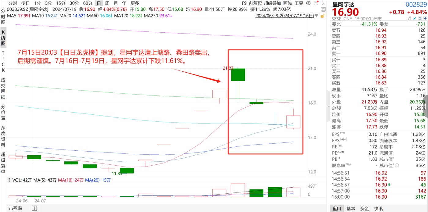 (1)7月15日20:03【日日龙虎榜】提到,星网宇达遭上塘路、桑田路卖出,后期需谨慎。