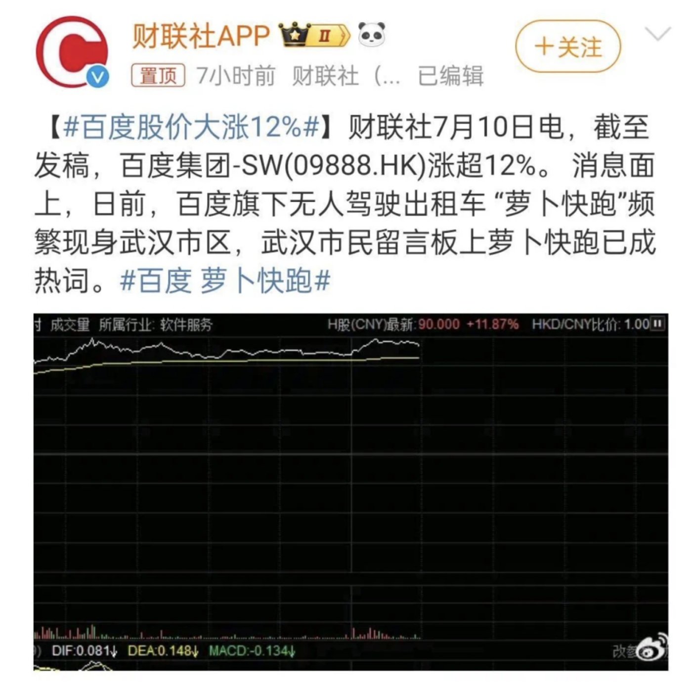 萝卜快跑进入武汉,引发的是从高度热议到高度争议的一个舆论演变。初入武汉时,萝卜快跑没有被视为出租车、网约车司机的抢食者,反而其全副武装的“科技范儿”,让武汉成为“全球无人驾驶第一城”,甚至带动了百度股价一度大涨12%。