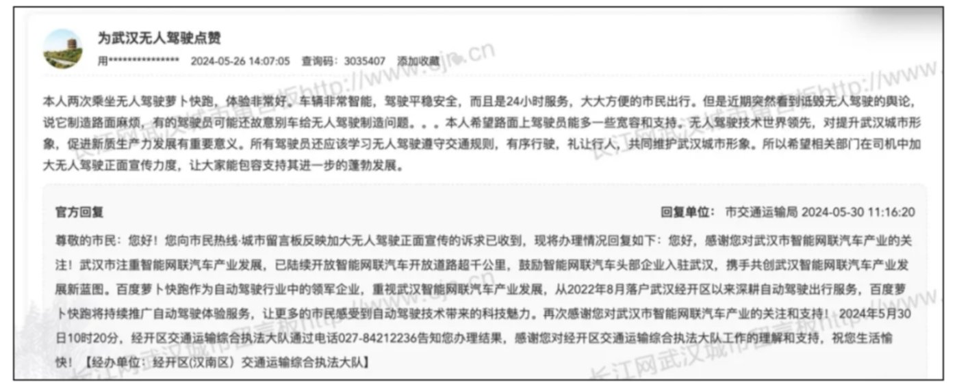 6月1日湖北发布官方公众号刊发的题为《武汉打造“全球无人驾驶第一城”,你怎么看?》一文中,特意提到,5月30日,在武汉城市留言板上,武汉市交通运输局针对市民“加大无人驾驶正面宣传的诉求”给出的回应引起了广泛关注。