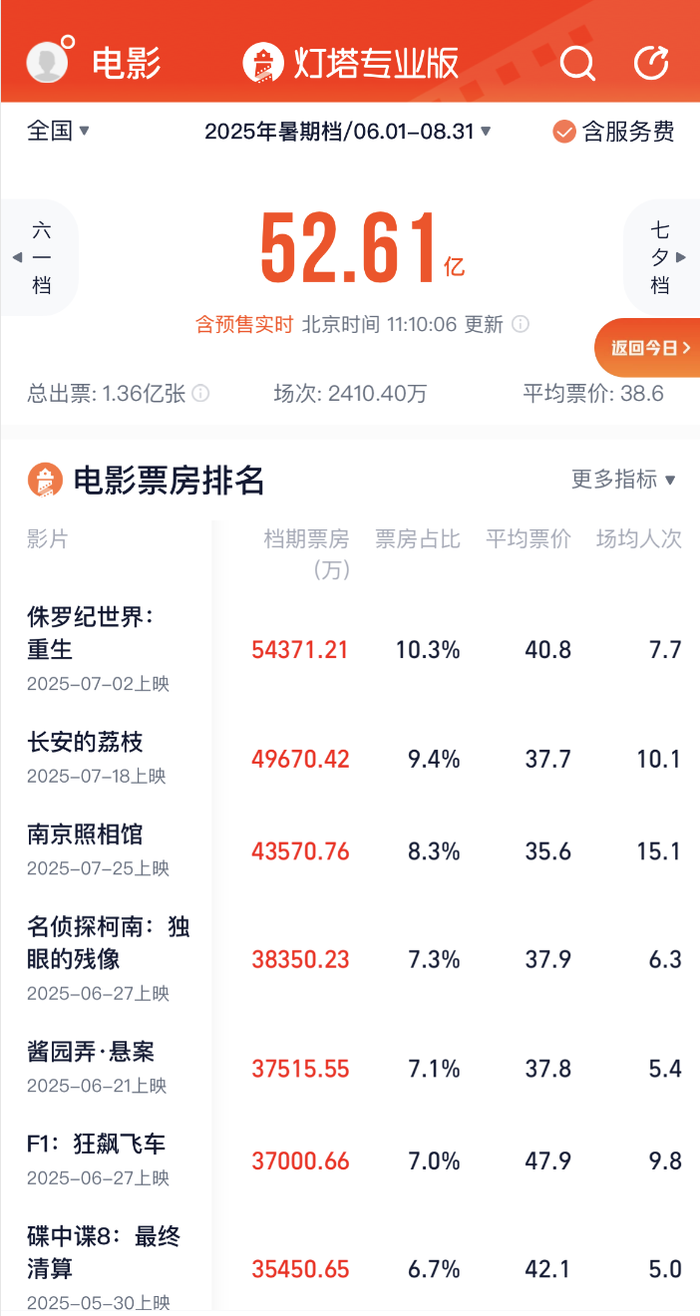 截至7月28日11时09分,今年暑期档总票房(含预售)刚突破52亿元,总观影人次为1.37亿,放映场次达2413.99万次。(图片来源:灯塔电影)
