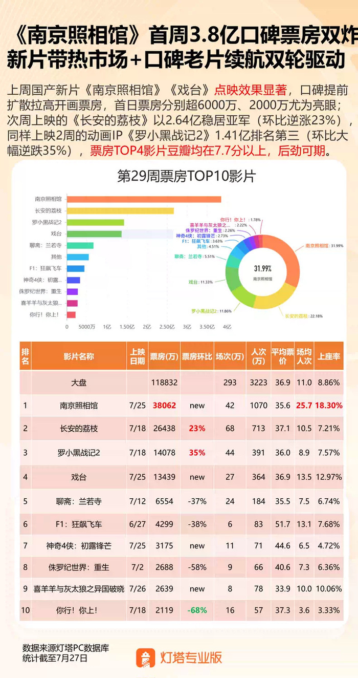 其中《南京照相馆》的表现最为抢眼。影片于7月25日上映,当天即斩获1.42亿元票房,打破了暑期档的低迷局面,灯塔预测其最终票房可能冲上31.7亿元。这部影片吸引了大量结伴观影的观众,尤其是家庭群体,而江苏多地的票房贡献占比超过50%。