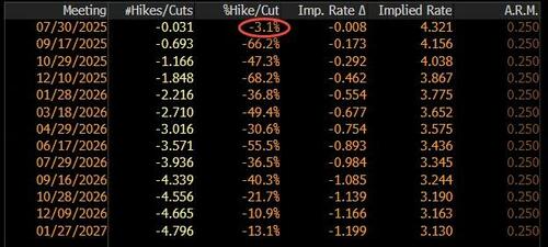目前,外界普遍预计,美联储在7月29日至30日的会议结束时,美联储政策制定者将连续第五次会议维持利率目标区间在4.25%-4.5%不变。利率市场的定价显示,美联储在今晚议息会议上降息的可能性仅有可怜的3%!