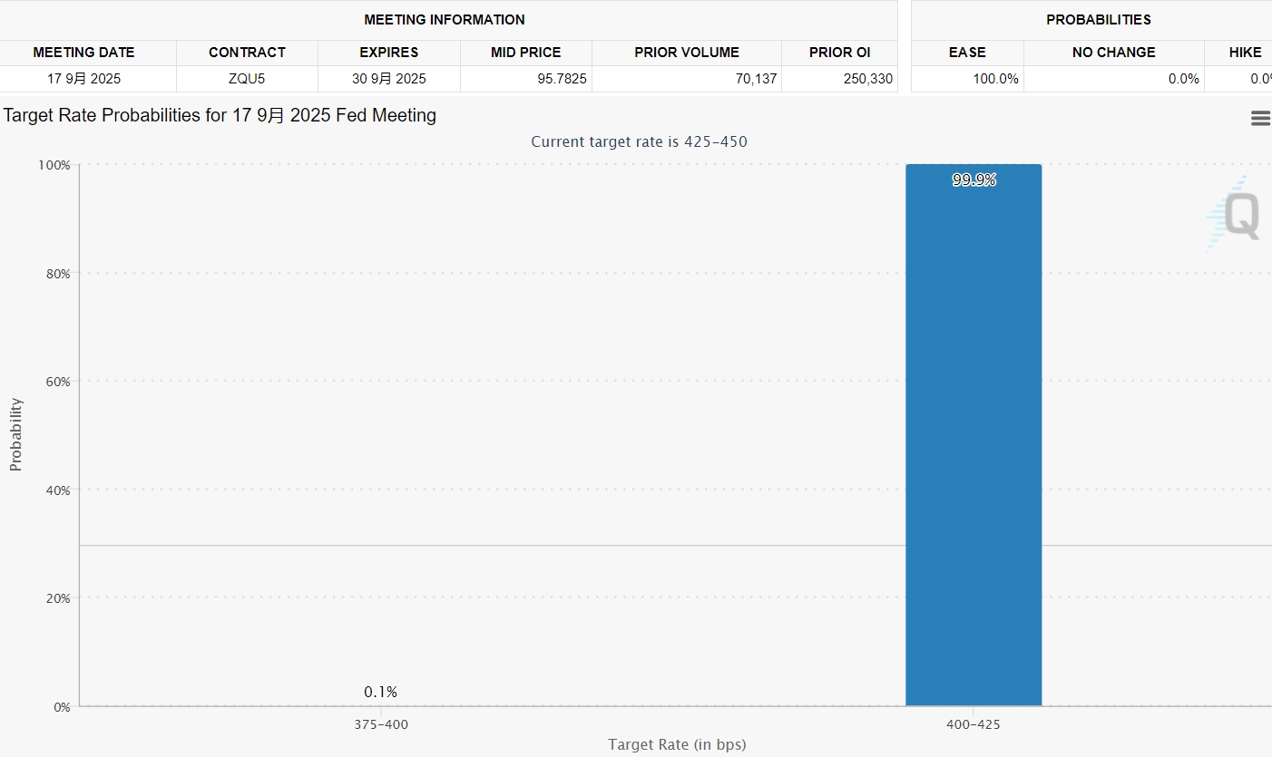 在最新数据显示美国7月通胀温和上升,以及贝森特发表上述评论之后,市场对美联储9月降息的预期已接近100%。