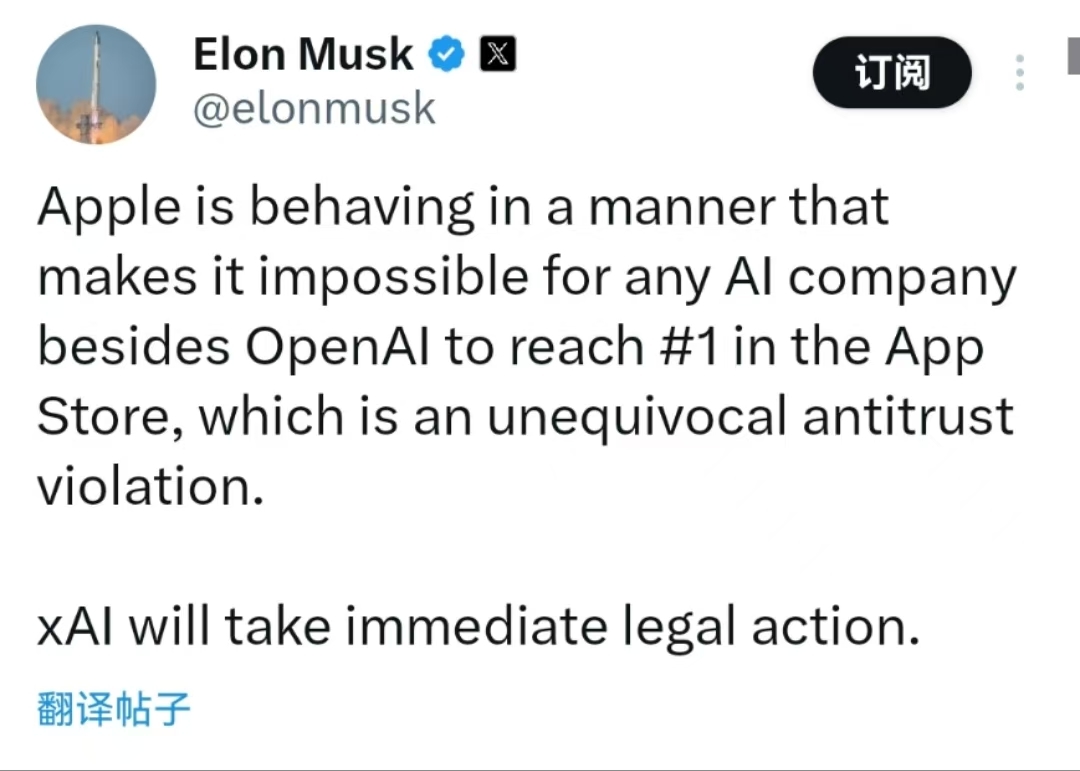 马斯克在社交媒体平台X上写道:“苹果的行为使得除OpenAI之外的任何一家人工智能公司都无法登上App Store榜单第一名,这显然违反了反垄断法。xAI将立即采取法律行动。”