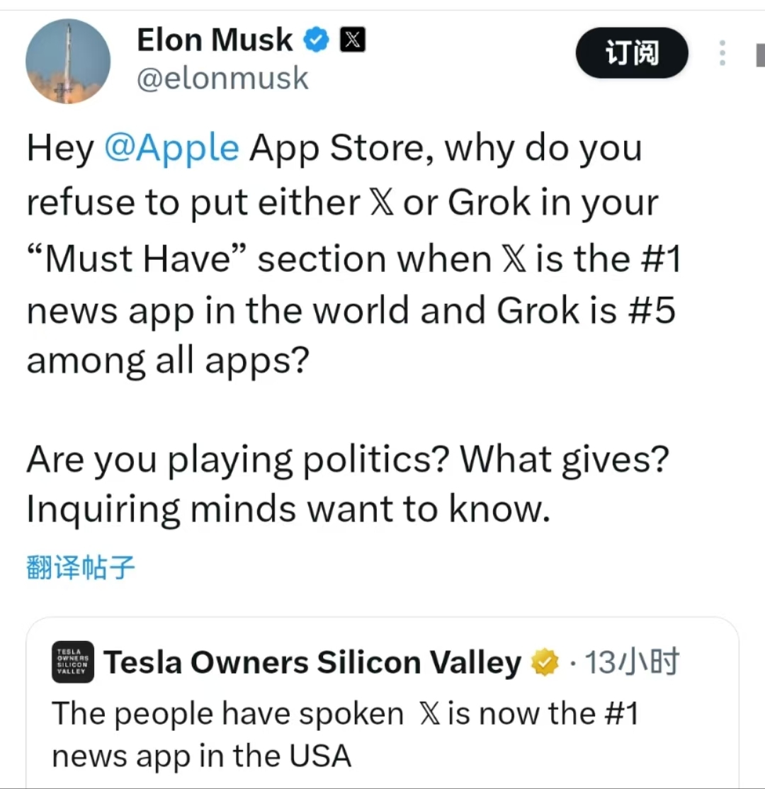 他还在另一条帖子中写道。:“当X是全球排名第一的新闻应用,而Grok在所有应用中排名第五时,为什么你拒绝将X或Grok放在你的”必备应用“部分?你是在玩弄政治吗?”
