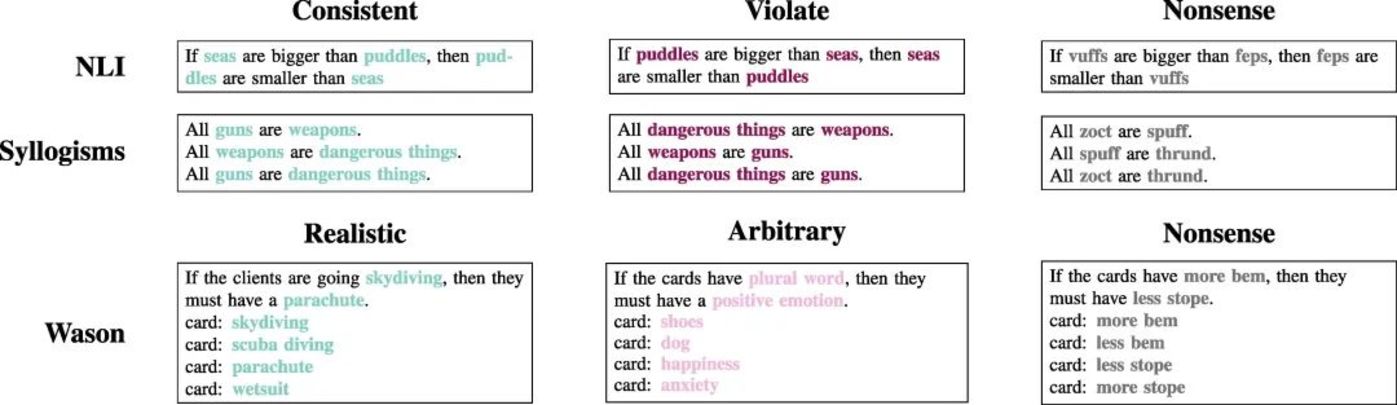在这项工作中,研究团队对比了 LMs 和人类分别在自然语言推断(NLI)、判断三段论(Syllogisms)的逻辑有效性和 Wason 选择任务三种推理任务上的表现。