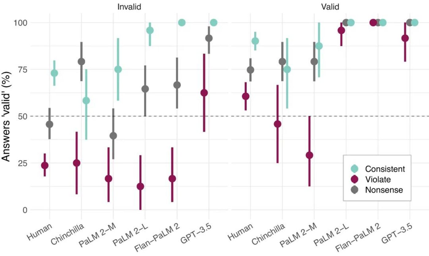图|三段论逻辑任务详细结果。人类和模型都表现出明显的内容效应 ,如果结论与预期一致(青色),会有很强的偏向性认为论证有效;如果结论违背预期(紫色),则有一定的偏向性认为论证无效 。