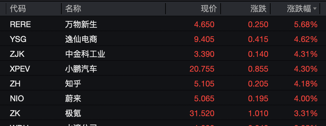上涨的中概股有:万物新生上涨超5%,小鹏汽车、蔚来汽车和极氪均上涨。