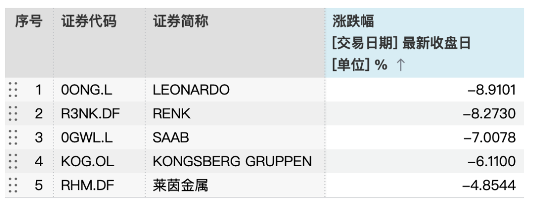 欧洲军工股跌幅较大,Leonardo收跌8.91%,RENK跌8.27%,Saab跌7.01%,Kongsberg Gruppen跌6.11%,德国莱茵金属RHM跌4.85%。