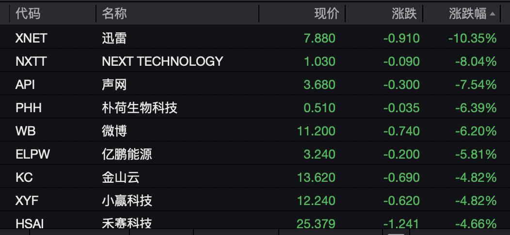 迅雷跌超10%,声网下跌7.54%,微博跌超6%,金山云下跌近5%。