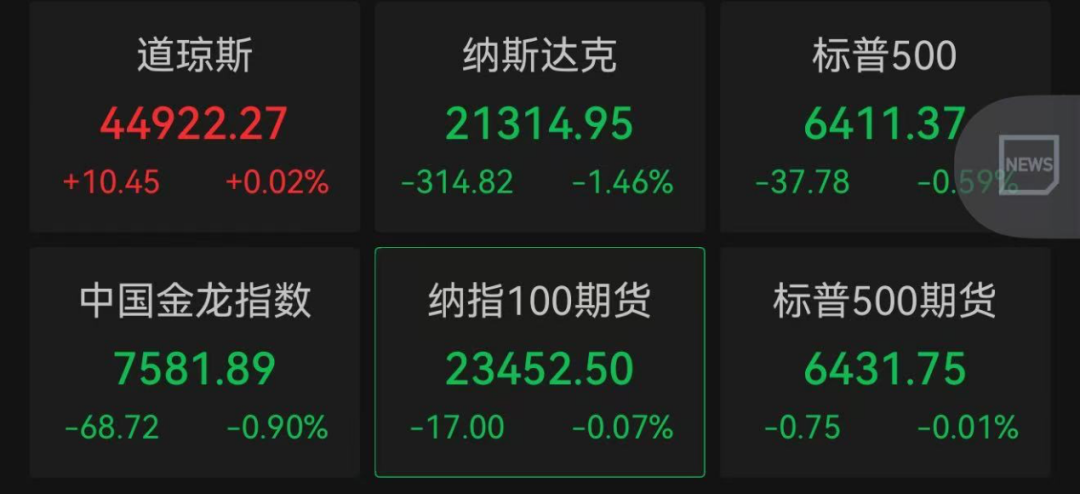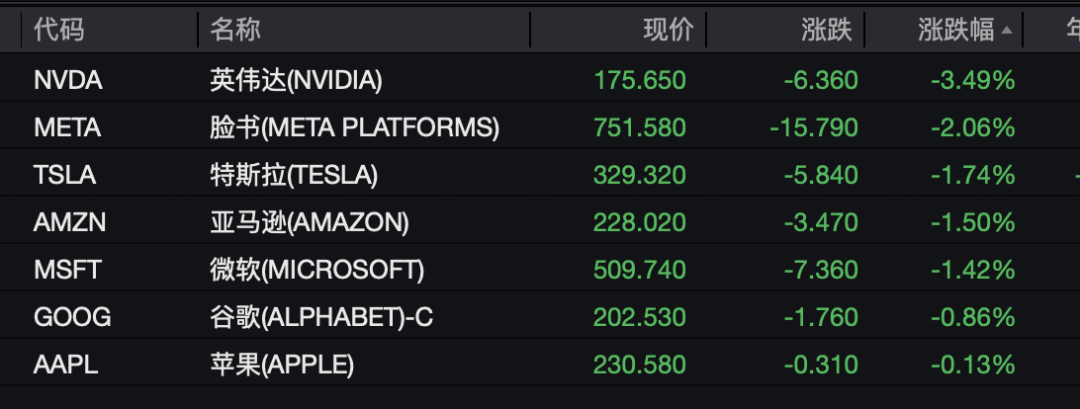 大型科技股普跌,拖累纳指表现。英伟达下跌近3.50%,Meta下跌逾2%,特斯拉、亚马逊、微软等均下跌。