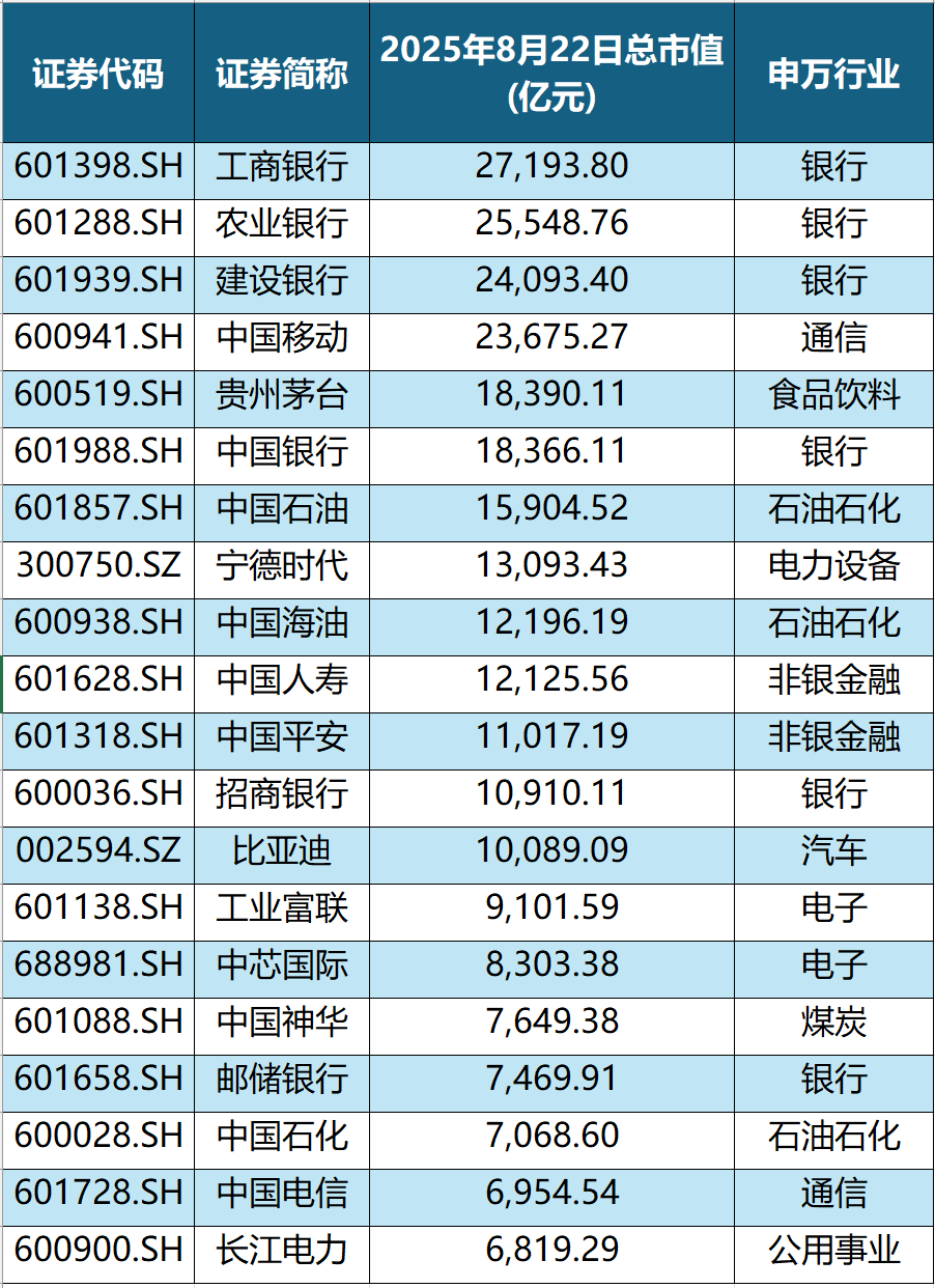 头部市值阵营中,中国移动、比亚迪、宁德时代市值均突破万亿元;工业富联、中芯国际也以超过8000亿元市值排名第14、15名;美的集团、寒武纪亦成功进入前30名,新兴产业龙头的市值话语权显著提升。