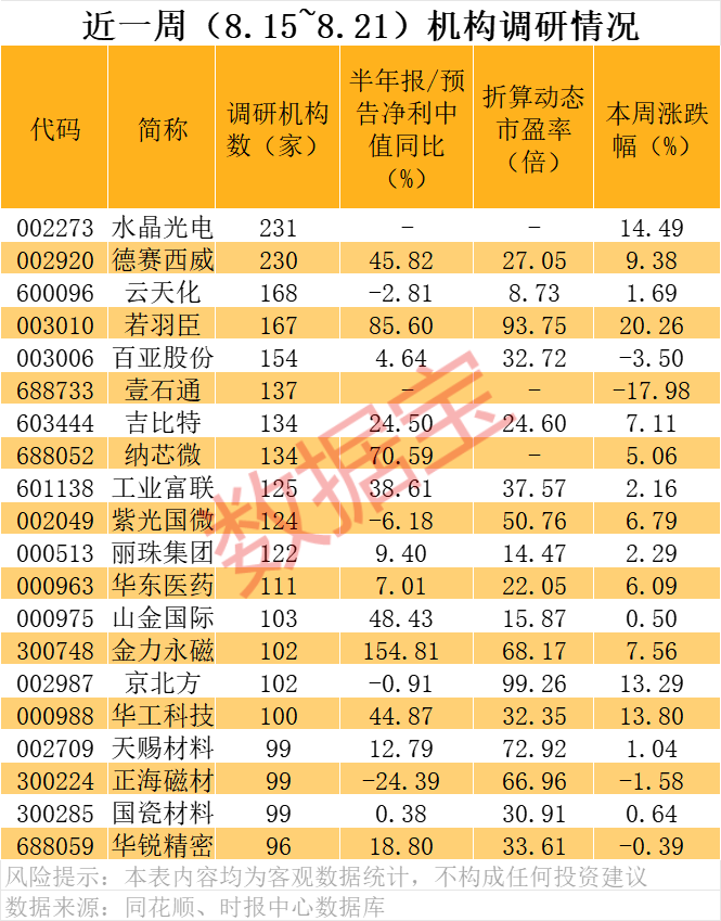 德赛西威、云天化、若羽臣、百亚股份等个股近一周均获得逾百家机构调研,其中A股科技龙头工业富联(601138)获得125家机构调研。