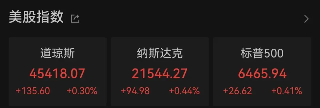 截至收盘,道指涨0.3%,报45418.07点,标普500指数涨0.41%,报6465.94点,纳指涨0.44%,报21544.27点。