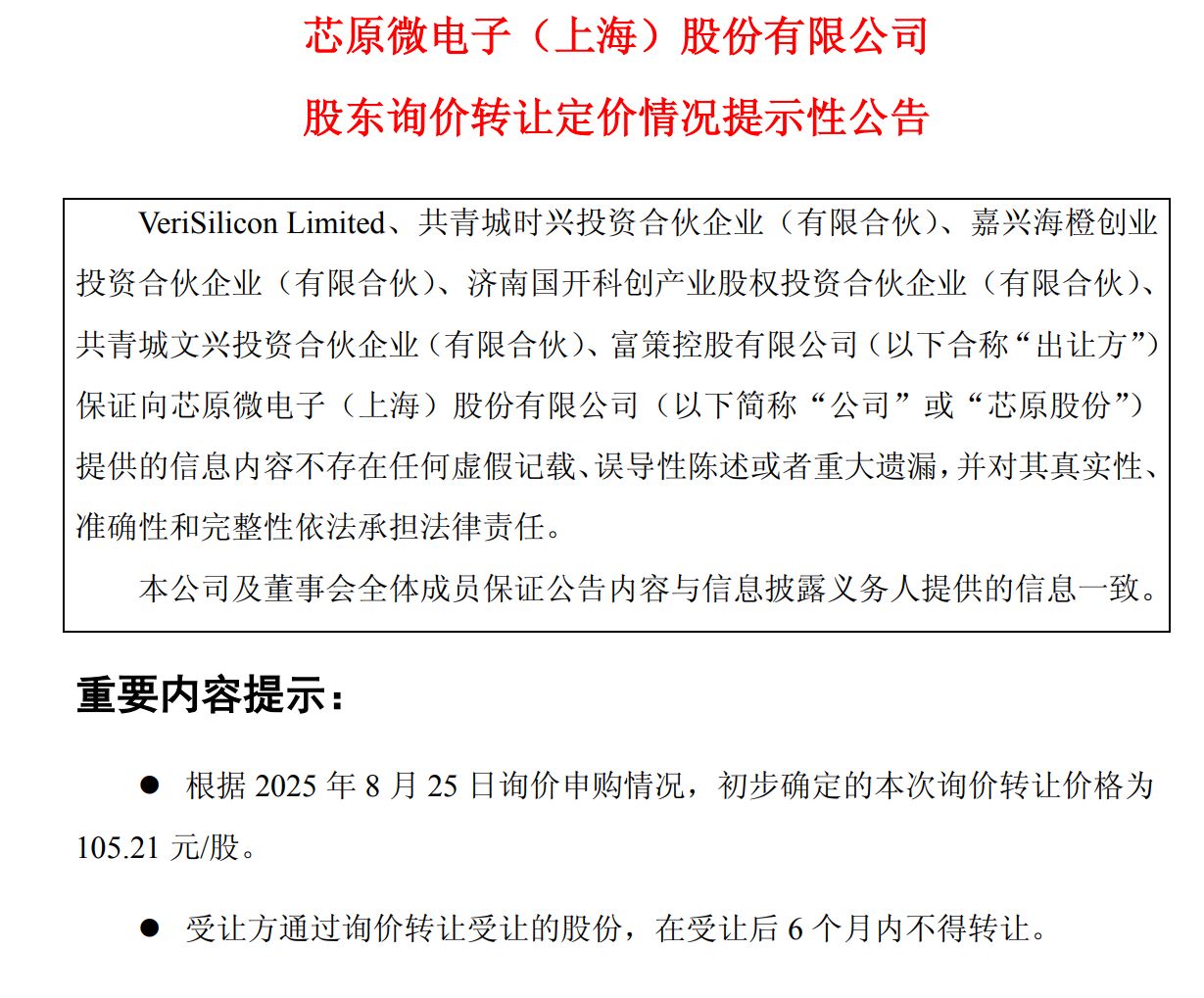 8月25日晚间,芯原股份(688521.SH,股价157.90元,市值830.10亿元)披露股东询价转让定价情况,向机构投资者询价后,初步确定的转让价格为105.21元/股。截至8月25日收盘,芯原股份报157.90元/股,即询价转让定价为当日收盘价约66.63%,不足七成。