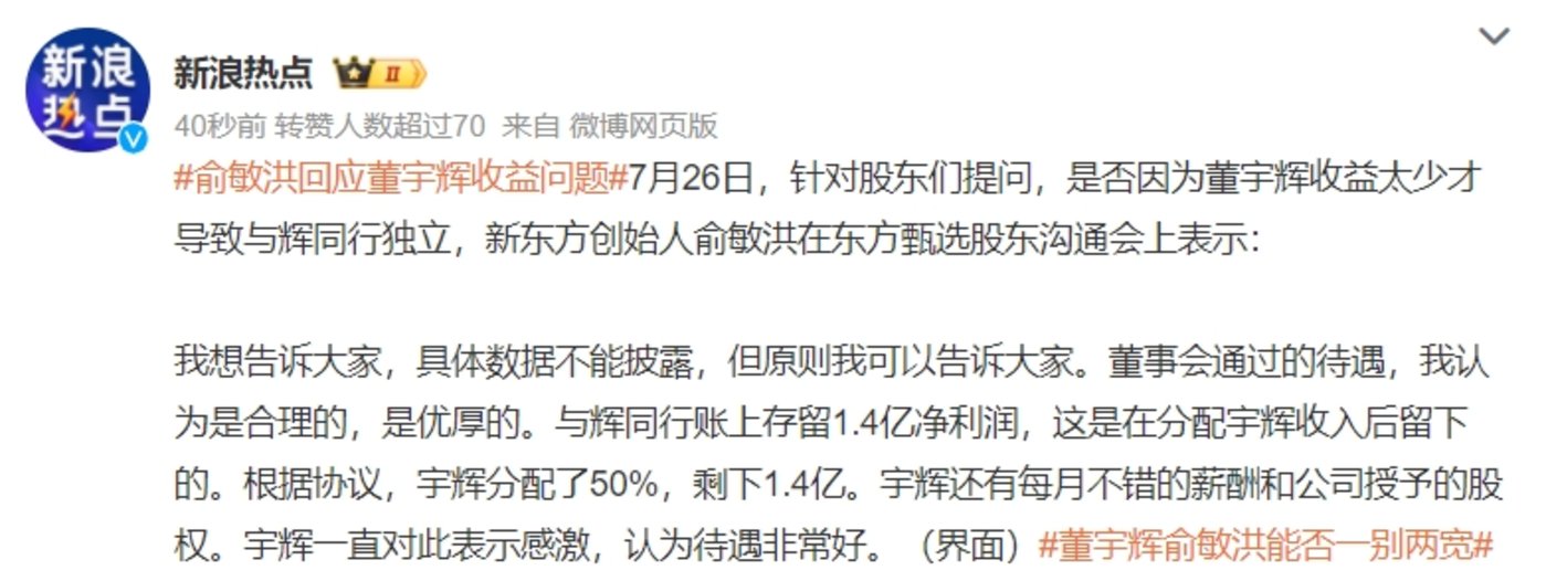 当提到董宇辉的离开是不是因为待遇不够的时候,俞敏洪解释道,到现在“与辉同行”账上还趴着1.4亿元的利润,这个利润是在董宇辉已经拿走了全部利润50%之后的结果,换句话说董宇辉个人已经拿走了1.4亿元的奖励;此外,这原本应该100%属于东方甄选的1.4亿元利润被赠予与辉同行,其主要的原因除了表达对董宇辉以及对社会的善意之外,还有就是董宇辉原本也有股权激励,但是由于他不再任职这部分股权激励也将终止,所以相当于这部分钱折现了。