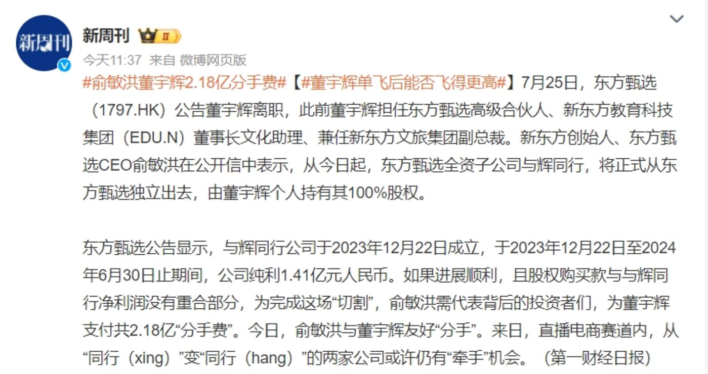 7月25日,东方甄选控股有限公司(东方甄选,01797.HK)发布公告称,董宇辉已决定不再担任公司雇员及公司一个合并联属实体的高级管理层,该离任乃由于董宇辉的职业抱负、对彼其他事业的投入及个人时间安排,于当天生效。