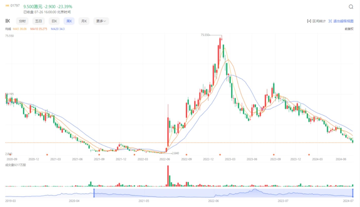 二级市场上,东方甄选的股价从2022年6月开始暴涨,一路从3.7港元/股暴涨到最高的75.7港元/股,市值直接翻了20多倍;到了2023年,东方甄选股价开始回弹,一直到去年底“小作文事件”之后,股价开始呈现强下滑趋势。