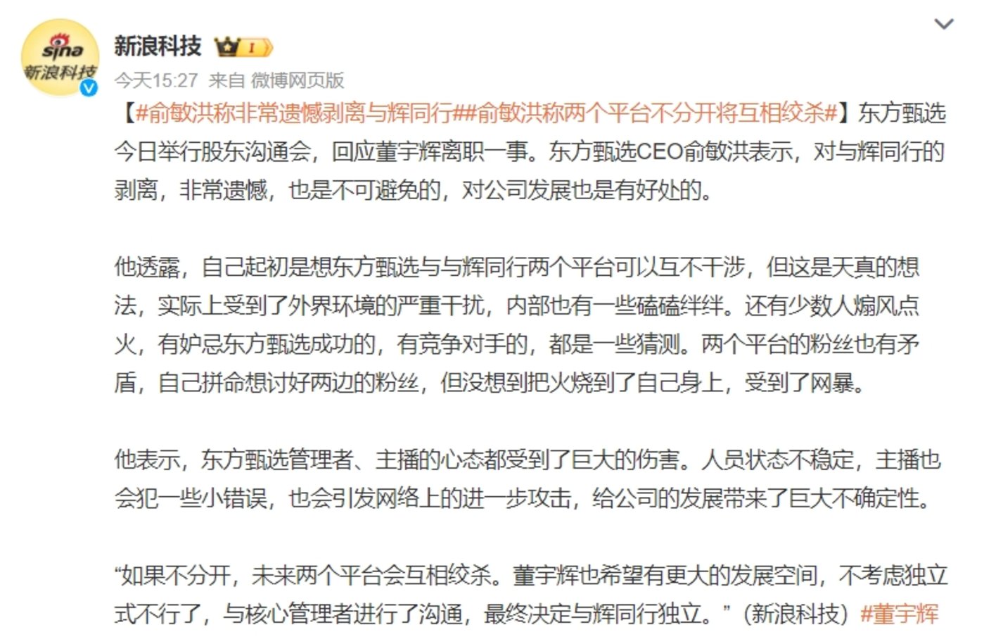 比起这份略显冰冷的声明,俞敏洪在自己公众号老俞闲话写的《致东方甄选股东朋友的一封公开信》中关于董宇辉的单飞就充满领导者与大功臣之间充满无奈的“BE色彩”了。