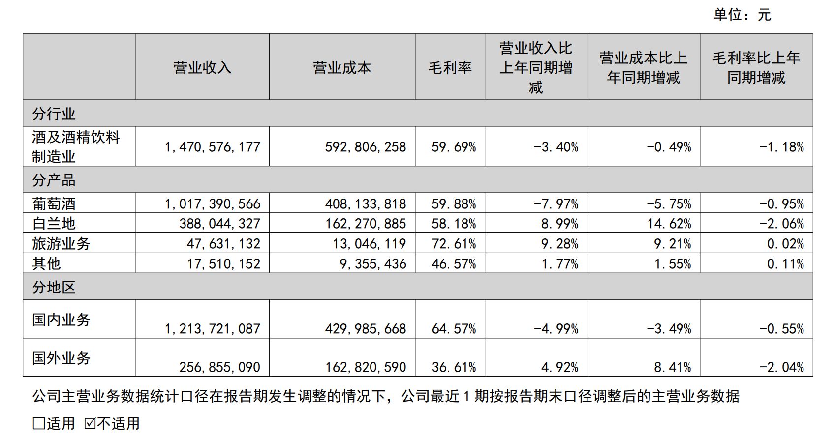 相比之下,白兰地业务则呈现出增长趋势,今年上半年无论是销量还是营收均实现增长。数据显示,上半年公司白兰地销量同比增长14.88%,实现营收约3.88亿元,同比增长8.99%;毛利率则同比下滑至58.18%。