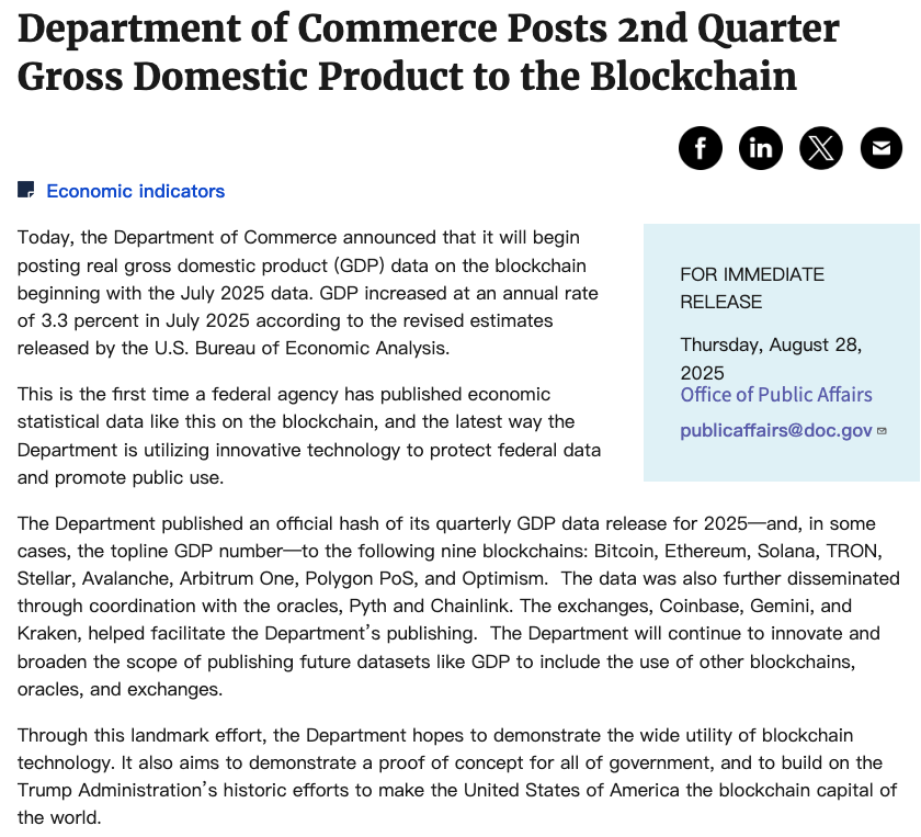 公告显示,美国商务部已经将2025年季度GDP数据的官方哈希值上传至九条区块链:比特币、以太坊、Solana、波场、恒星链、Avalanche、Arbitrum One、Polygon PoS和Optimism。美国商务部还与预言机网络Pyth和Chainlink合作,将这些数据在更广泛的区块链上传播。