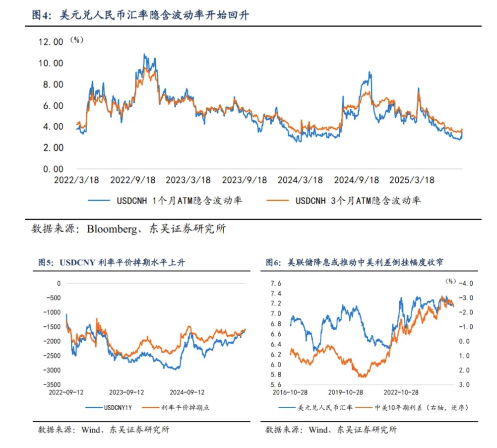 人民币“套息交易”面临平仓风险。2025年5月份以来,受到“港元套息交易”的影响,人民币套息交易也正在重启,中美利差继续保持约260bps的深度倒挂为人民币套息提供了足够多的空间、年初至今人民币汇率保持较低的波动率为套息交易提供了生根的土壤。8月28日之前,美元兑人民币隐含波动率持续下行,1个月和3个月期USDCNH平价期权隐含波动率一度分别低破3.0%和3.5%,均达到2024年11月以来最低值,并且隐含波动率一度低于实际波动率,推动人民币期权市场“风险溢价”走向负值,但是与“融资人民币→掉期为美元→投资美元高利率资产”的传统套息交易不同,5月份以来重启的人民币套息,更加显示为结售汇科目出口部门以S/B掉期替代即期结汇,因此在5月至8月期间,尽管中间价释放引导升值的信号,可人民币套息交易限制了即期汇率升值的节奏。8月28日至8月29日亚盘时段,USDCNH平价期权1个月期隐含波动率快速回升至3.40%上方,3个月期隐含波动率回升至3.75%,人民币汇率波动率陡然上升,或已经打破“套息交易”赖以存续的环境。