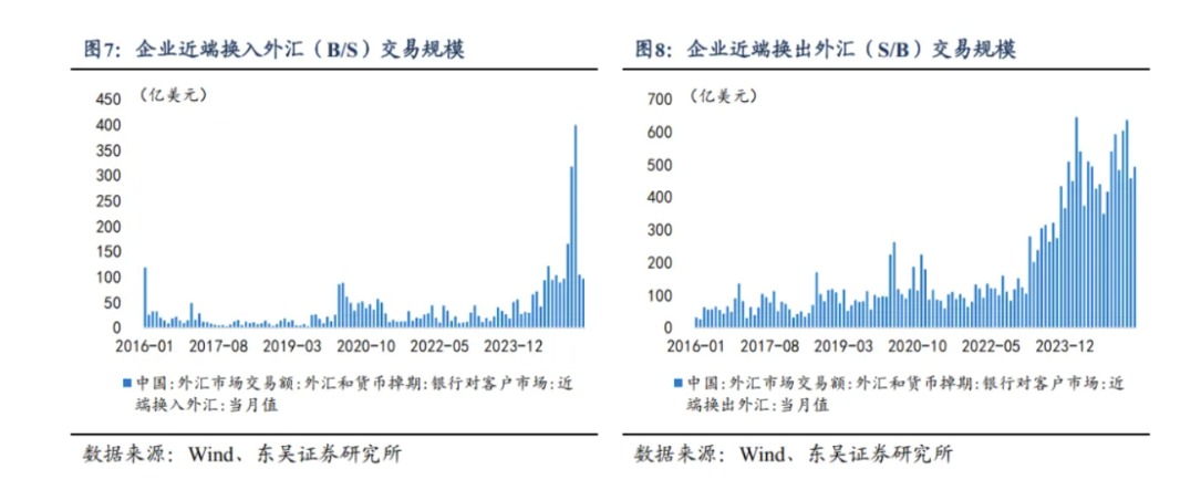 2025年1-7月出口企业主动结汇率边际回升。相比2025年上半年出口企业货物贸易科目主动结汇率47.13%,7月份货物贸易结汇率加快回升至48.24%,趋近2024年同期的48.28%,而货物贸易主动售汇率则基本保持在48.43%左右,“结汇回升、售汇稳定”的外汇市场供需格局有利于人民币升值。如同我们在过往报告中多次强调的逻辑,出口企业“待结汇盘”是影响人民币汇率波动的主线之一,2024年8月至10月以日元套息交易平仓为引线、人民币也曾因“待结汇盘”集中释放而出现快速升值,有序逢高结汇有利于维持汇率稳定,但“恐慌式结汇”或损害出口企业利润。