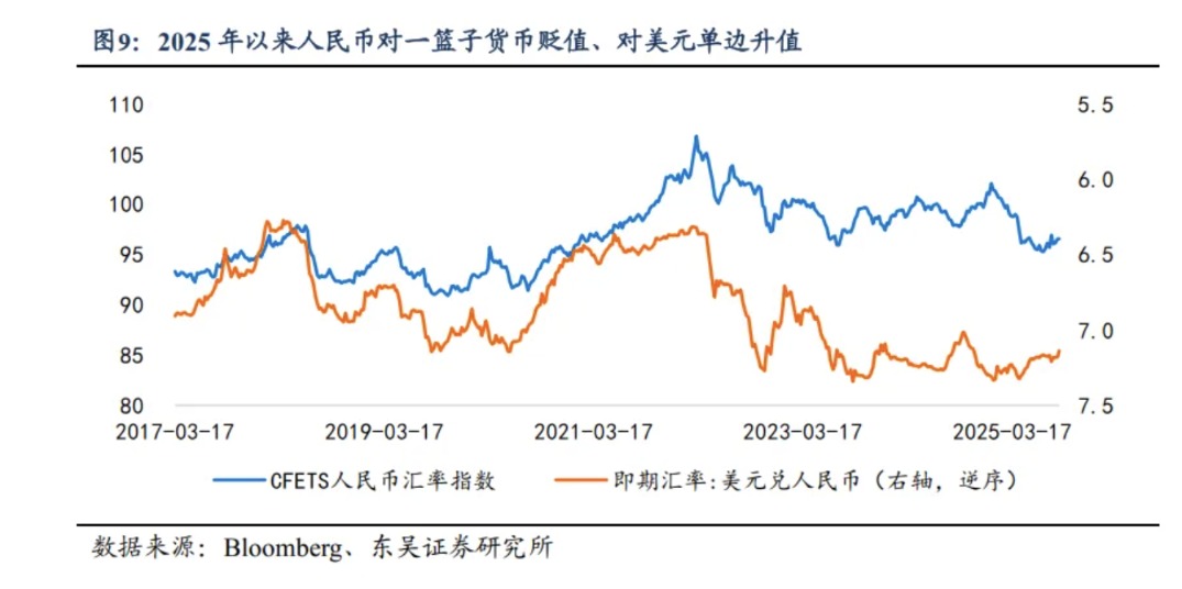 2025年以来,人民币呈现对一篮子贬值而对美元升值的特点,截至8月28日, USDCNY单边汇率累计升值2.20%,而CFETS人民币汇率指数累计贬值4.40%,映射至跨境资金流方面,人民币对一篮子货币贬值有利于对冲海外关税政策等风险的影响,呵护出口基本盘,而人民币对美元单边升值则有利于进一步吸引外资增配人民币金融资产。2025年7月,证券投资科目当月录得逆差582.9亿美元,超过2024年11月证券投资科目456.7亿美元的规模,也达到2020年以来单月最大净流出,而8月份人民币汇率快速升值或意味着证券投资逆差规模或正在收窄、跨境资金或再度回补人民币金融资产,并且升值预期或进一步加速回补的进度。