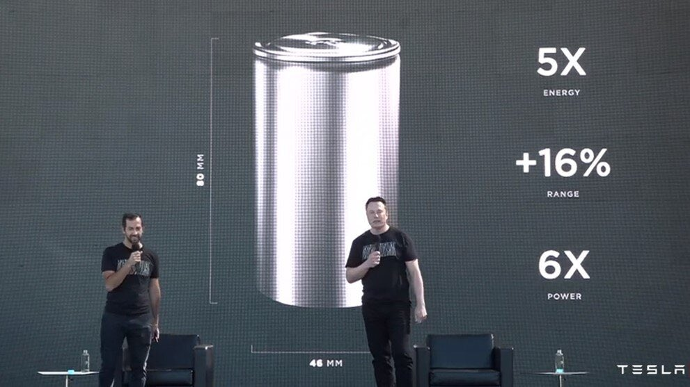 2020年,马斯克在特斯拉电池日上介绍4680电池 | 图片来源:直播截图