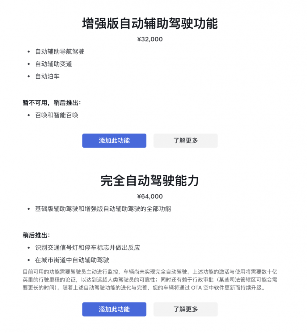 特斯拉高阶智能驾驶服务在国内的售价 | 图片来源:特斯拉中国官网