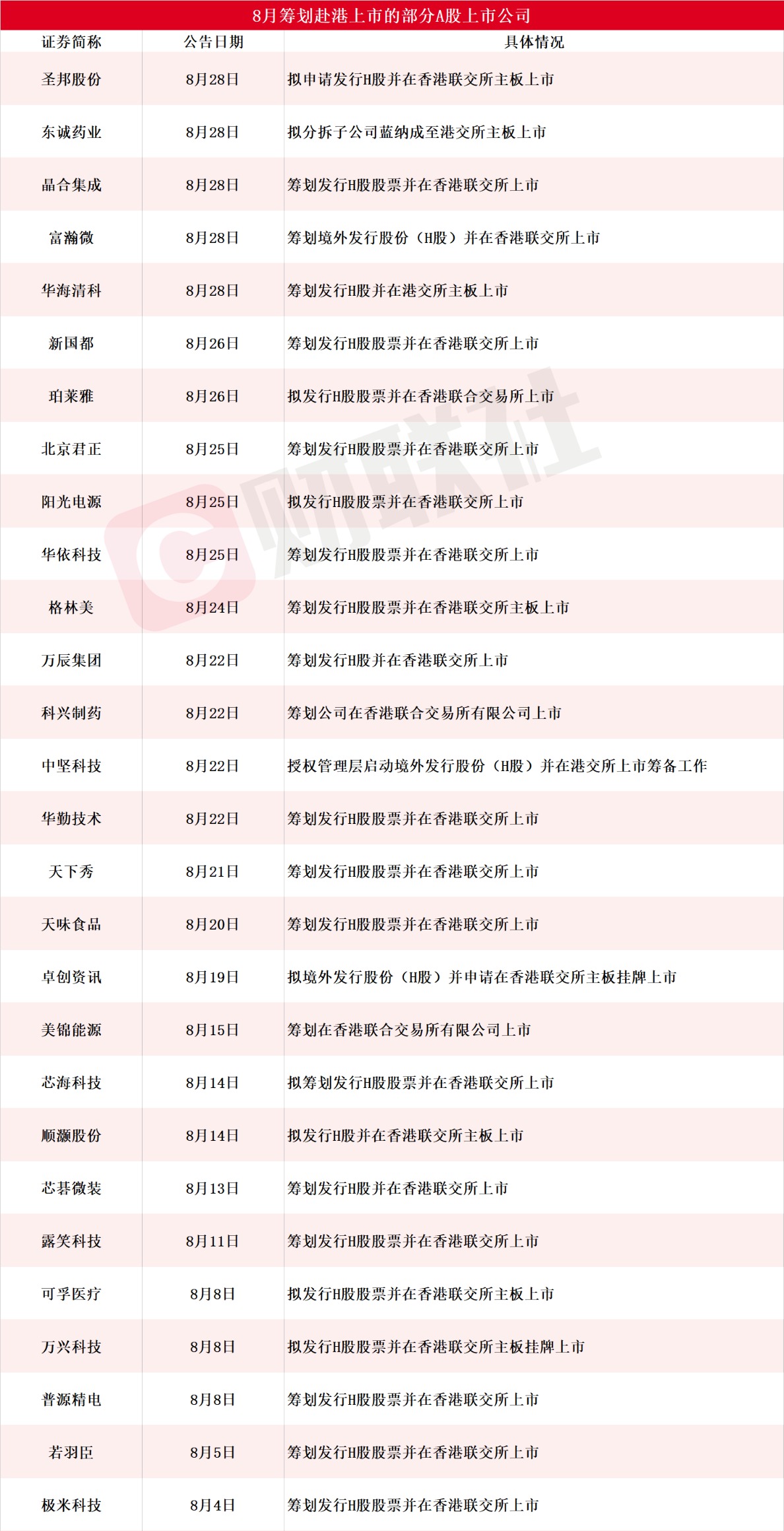 A股公司赴港IPO持续升温。据财联社不完全统计,截至发稿,8月份包括圣邦股份、东诚药业、晶合集成、富瀚微、华海清科、新国都、珀莱雅、北京君正、阳光电源、华依科技、格林美、万辰集团、科兴制药、中坚科技、华勤技术、天下秀、天味食品、卓创资讯、美锦能源、芯海科技、顺灏股份、芯碁微装、露笑科技、可孚医疗、万兴科技、普源精电、若羽臣和极米科技在内的28家A股上市公司披露筹划赴港上市,详细情况见下图: