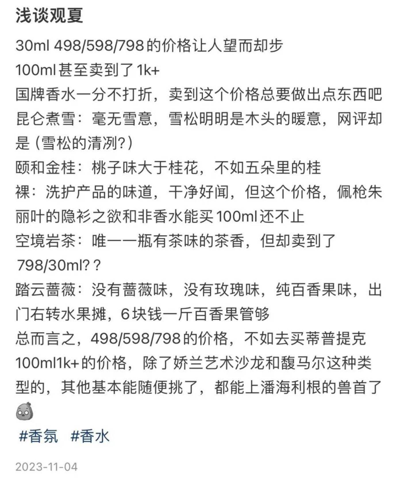 例如,单价直逼国际一线大牌的观夏,在社交平台上曾被一些消费者认为“留香时间太短、性价比好低”、“价不符实”、涨价等。