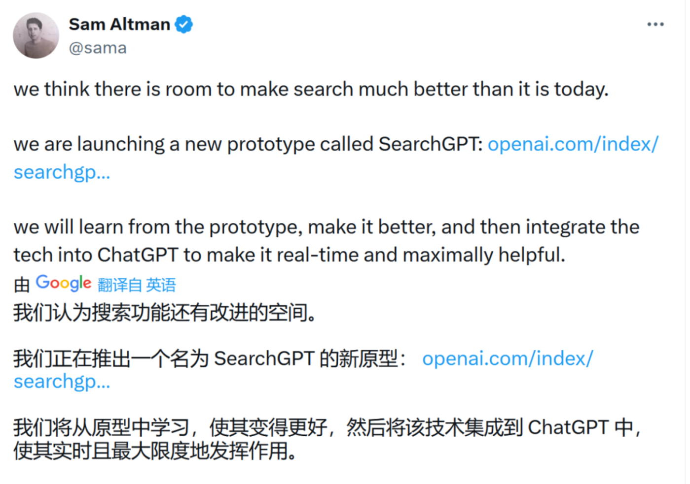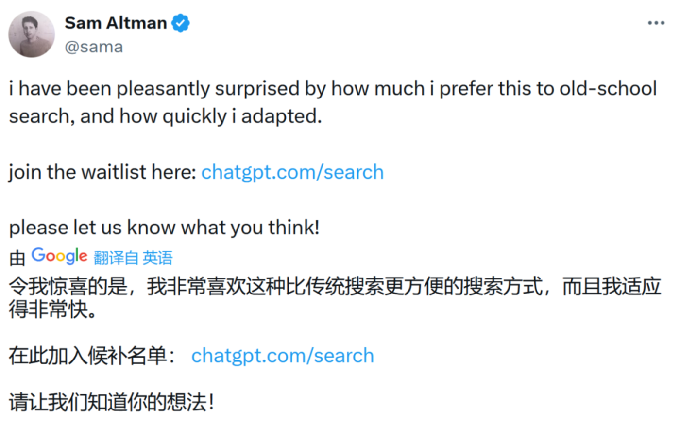 OpenAI CEO山姆·奥特曼在X(前推特)公布喜讯,比起夸自己,更像是diss前人:“我们认为如今的搜索还有改进的空间”,还说:“我惊喜地发现比起传统的搜索方式,我有多喜欢这个新方式,而且我适应得非常快。”