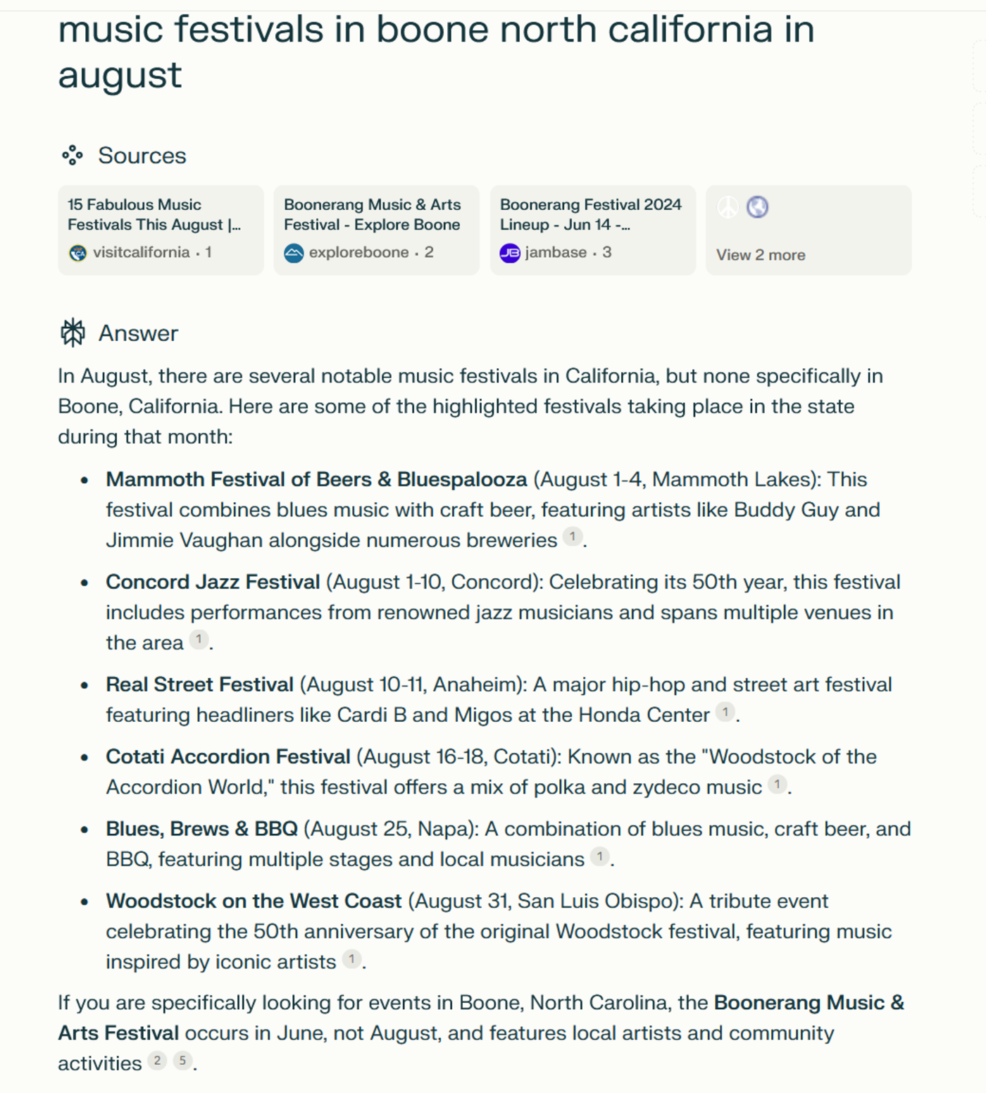 但这一次,在SearchGPT发布后被发现的错误就显得有些“不OpenAI”。在前文提到针对“2024年8月北卡罗来纳州布恩的音乐节”的回答中,SearchGPT被发现提供的好几个音乐节都早已经结束。这也意味着SearchGPT“准确回答用户问题”的能力也许并不突出,以相同的问题询问Perplexity,其未出现类似错误。