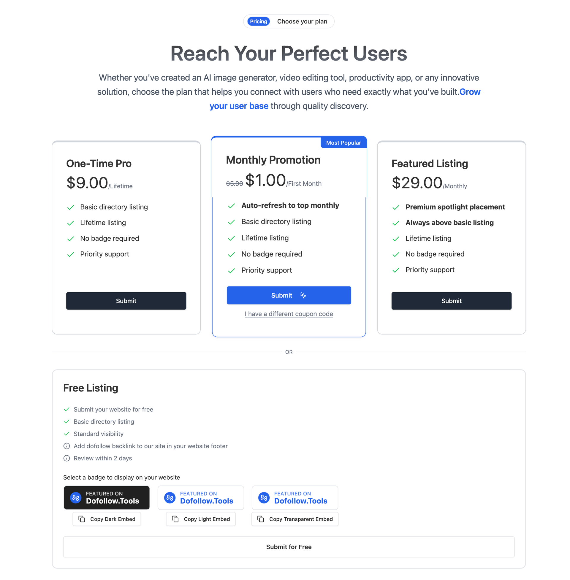 绝大部分导航站盈利能力比较弱,一方面是导航站本身盈利能力比 AI 工具站弱,另一方面是运营方式与定价计划无法匹配的问题。nexty-directory 提供了 4 种提交方式,你可以在不同阶段侧重不同的提交方式来运营: