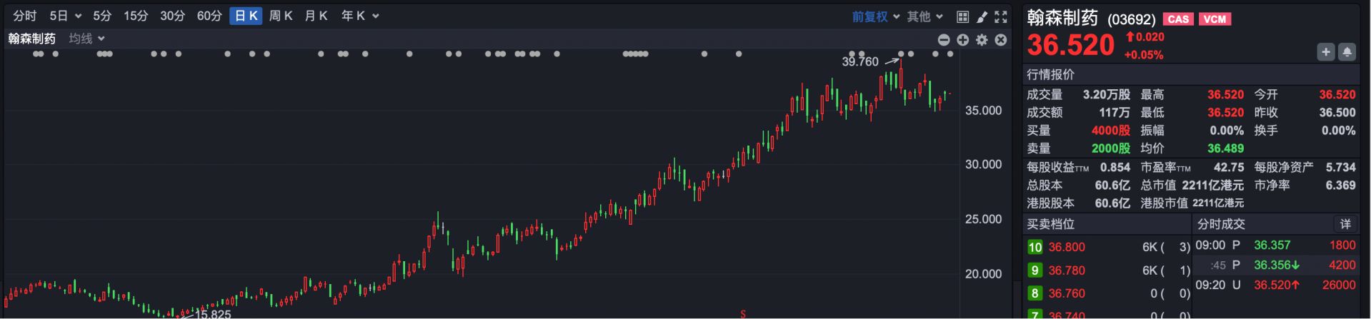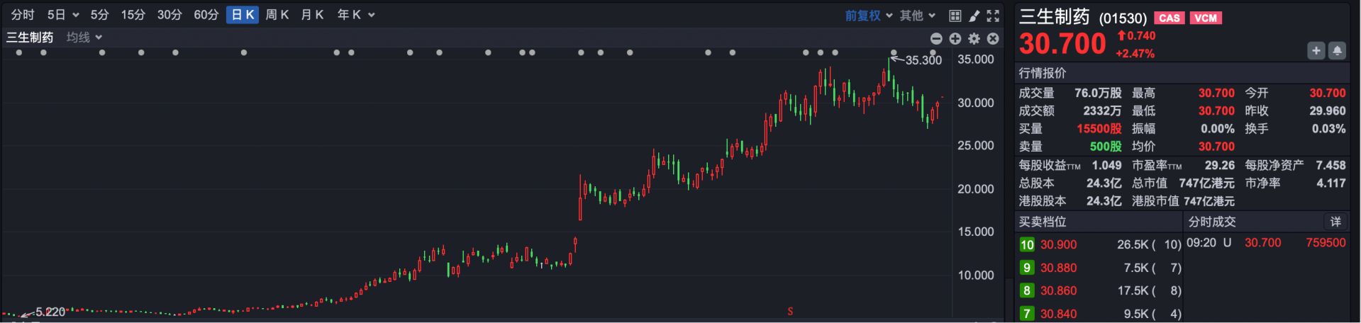 另一家医药股三生制药(01530,HK)也有重磅。香港联交所最新资料显示,8月26日,贝莱德增持三生制药4760.475万股,每股作价30.1096港元,总金额约为14.33亿港元。增持后最新持股数目约为1.24亿股,最新持股比例为5.1%。今年以来,三生制药累计涨幅近400%。今日早盘,三生制药涨超4%。