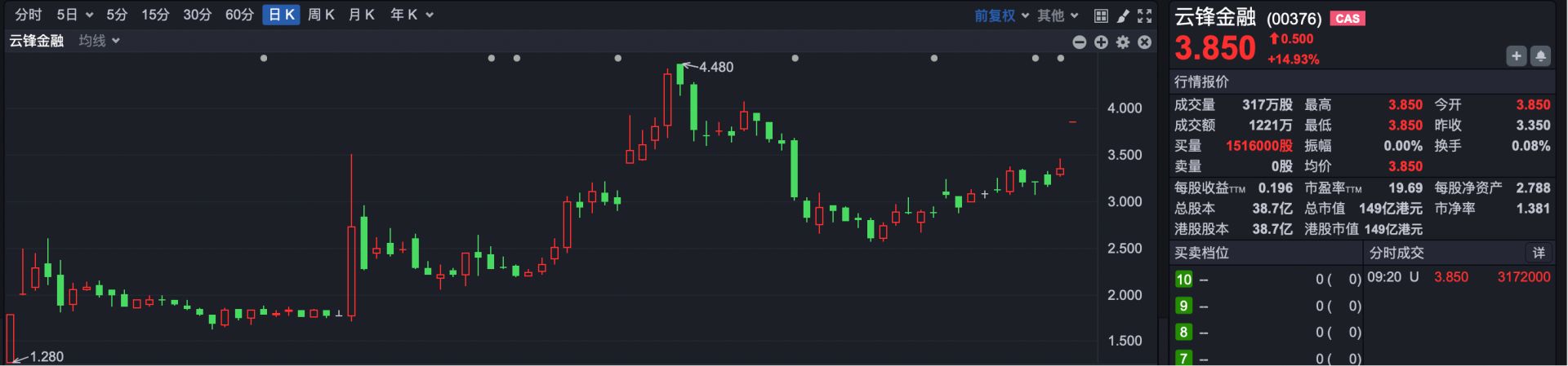 其他公司要闻,云锋金融(00376,HK)发布公告,宣布与蚂蚁数字科技(蚂蚁集团旗下科技商业化板块)达成战略合作协议,并宣布对专注于现实世界资产(RWA)代币化的新一代Layer1公链Pharos进行战略投资。今日早间,云锋金融高开近15%。