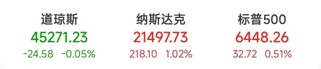 道指跌24.58点,跌幅为0.05%,报45271.23点;纳指涨218.10点,涨幅为1.02%,报21497.73点;标普500指数涨32.72点,涨幅为0.51%,报6448.26点。