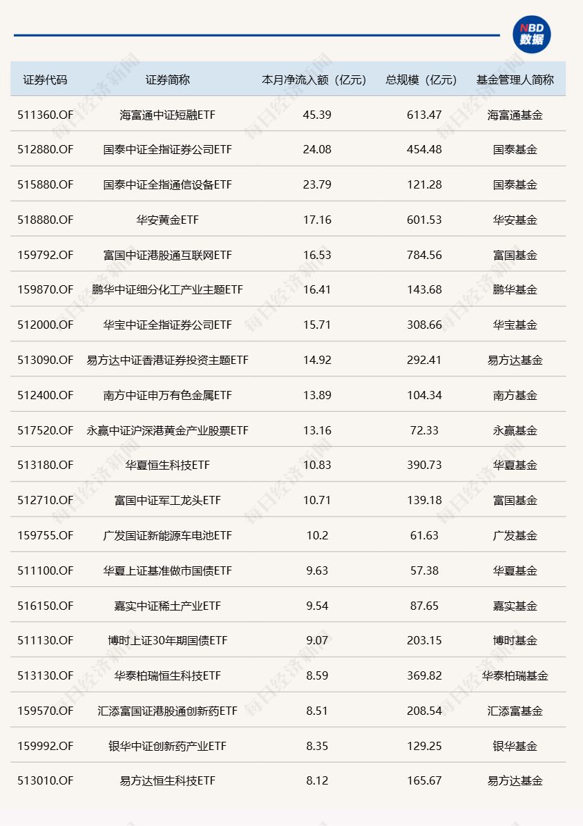 截至9月3日,本月资金净流入额居前20的ETF名单如下: