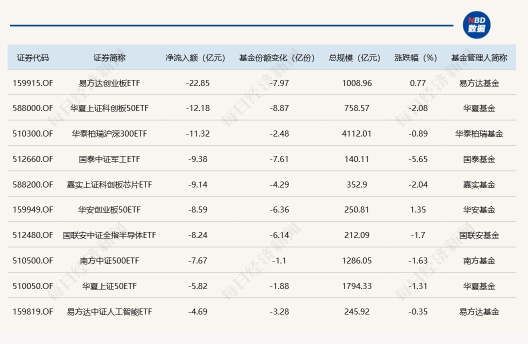 与此同时,易方达创业板ETF份额减少7.97亿份,净流出额22.85亿元;华夏上证科创板50ETF份额减少8.87亿份,净流出额12.12亿元;华泰柏瑞沪深300ETF份额减少2.48亿份,净流出额11.32亿元。