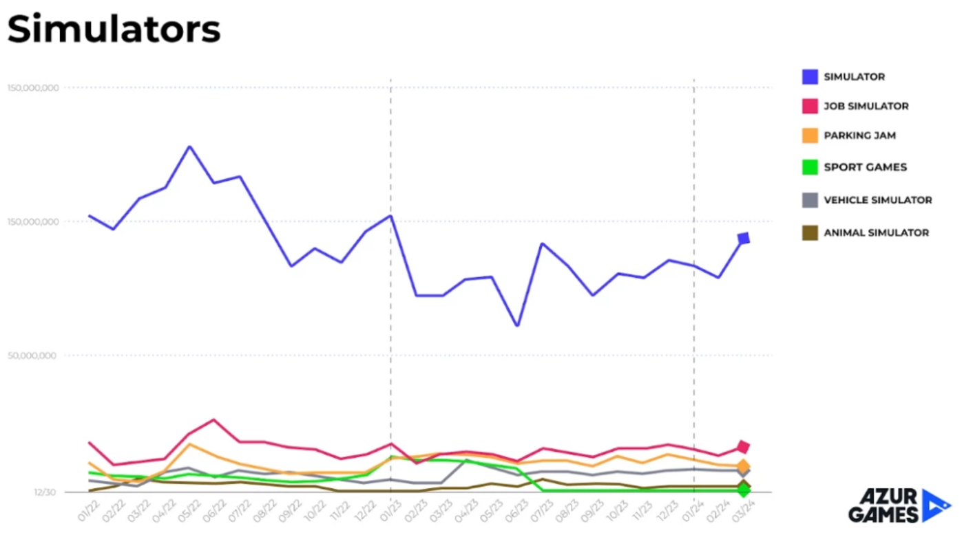 如果有单款游戏能够明显影响到市场,那可能表明这个品类正在重塑,老游戏们会逐渐被淘汰。模拟类的特点是它们可以自然地在游戏中融入各种玩法,这也是眼下在各个品类中都常见的趋势,此类游戏的表现会优于其他产品。