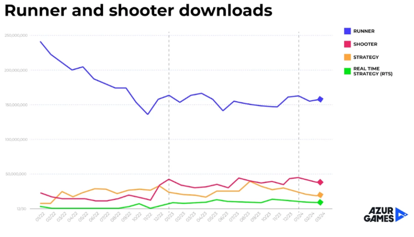 跑酷和射击品类整体没有太多变化,传统品类依然稳定。它们或许看上去趋势平缓,但在一个不断增长的市场中,这也是一个良好的走向。