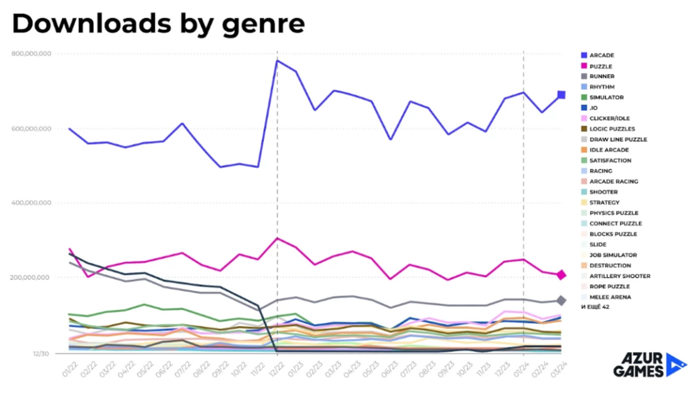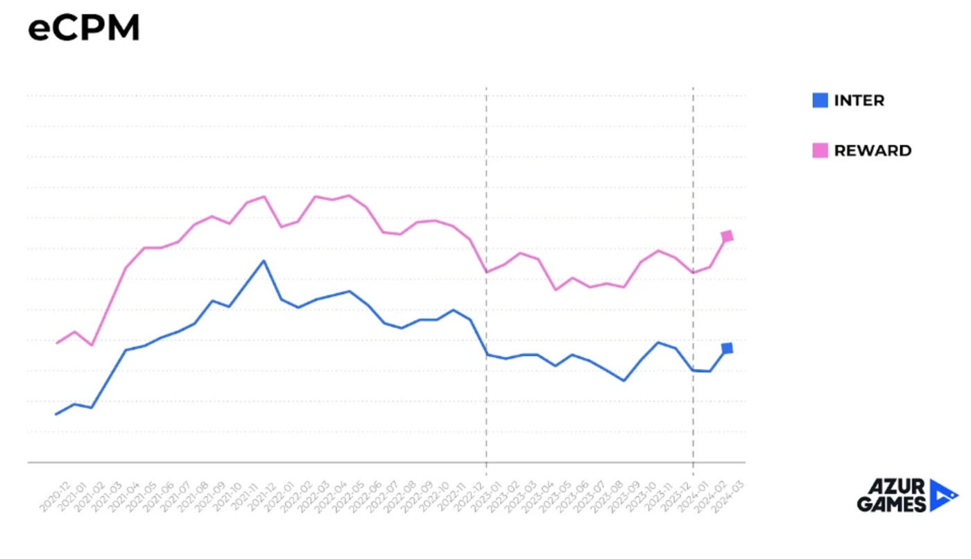 eCPM的情况也是类似,去年出现了明显的下滑。这是Azur Games内部的数据,虽然没有具体的数字指标,但展示了许多大型发行商大致的处境。eCPM是市场健康度的一个指标,因此它在2024年开头出现的增长令人鼓舞。